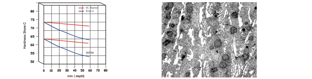贝氏体球铁轧辊加入镍、锰、铬、钼等合金元素,它是具有针状组织(贝氏体+少量马氏体)基体,比珠光体球铁轧辊强度更高,韧性更好,耐磨性也明显提高。可采用静态铸造或离心铸造生产。